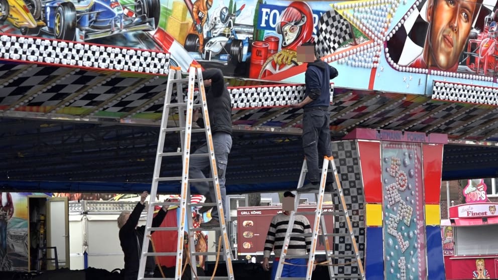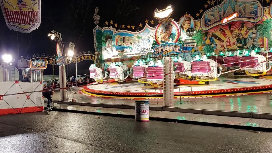 Vor dem Fahrgeschäft „Shake & Roll“ geschah die schreckliche Tat am Samstag. Die Polizei hat den Tatort mit Flatterband abgesperrt und einen Sichtschutz aufgebaut