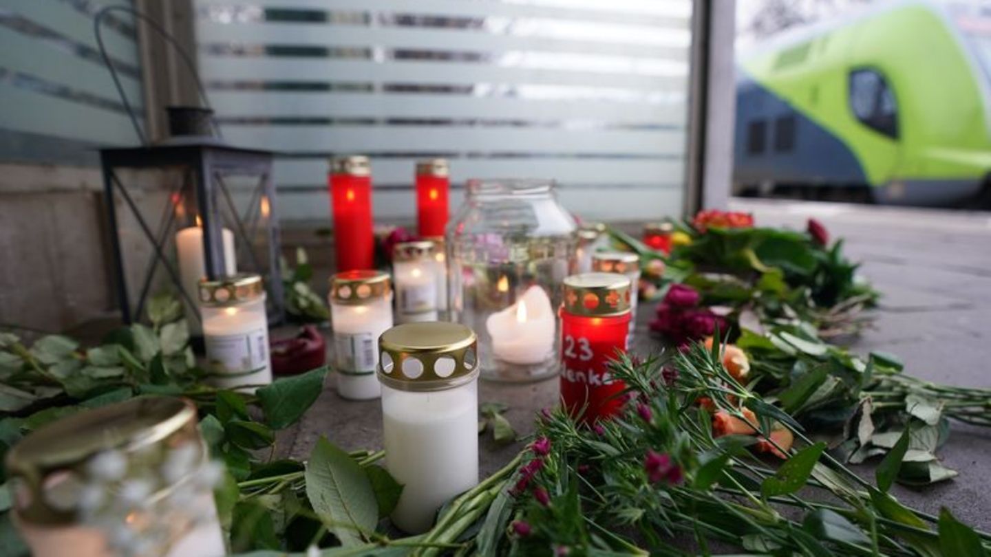 Blumen und Kerzen liegen auf dem Bahnsteig im Bahnhof von Brokstedt.