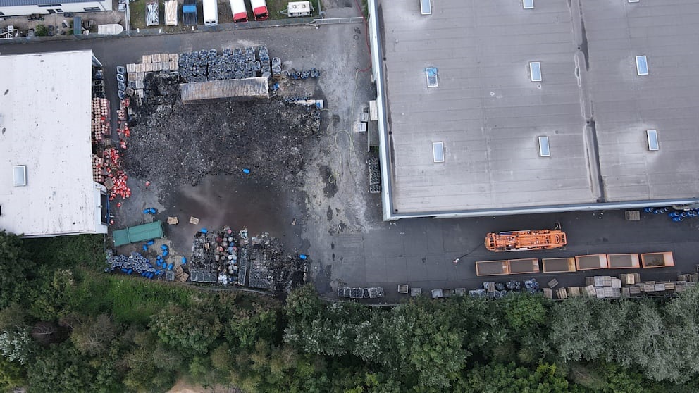 Der Brand-Hof am Tag danach: Die Elektro-Teile sind wegen extremer Hitze zusammengeschmolzen. Neben dem orangefarbenen Löschfahrzeug stehen Container befüllt mit Wasser